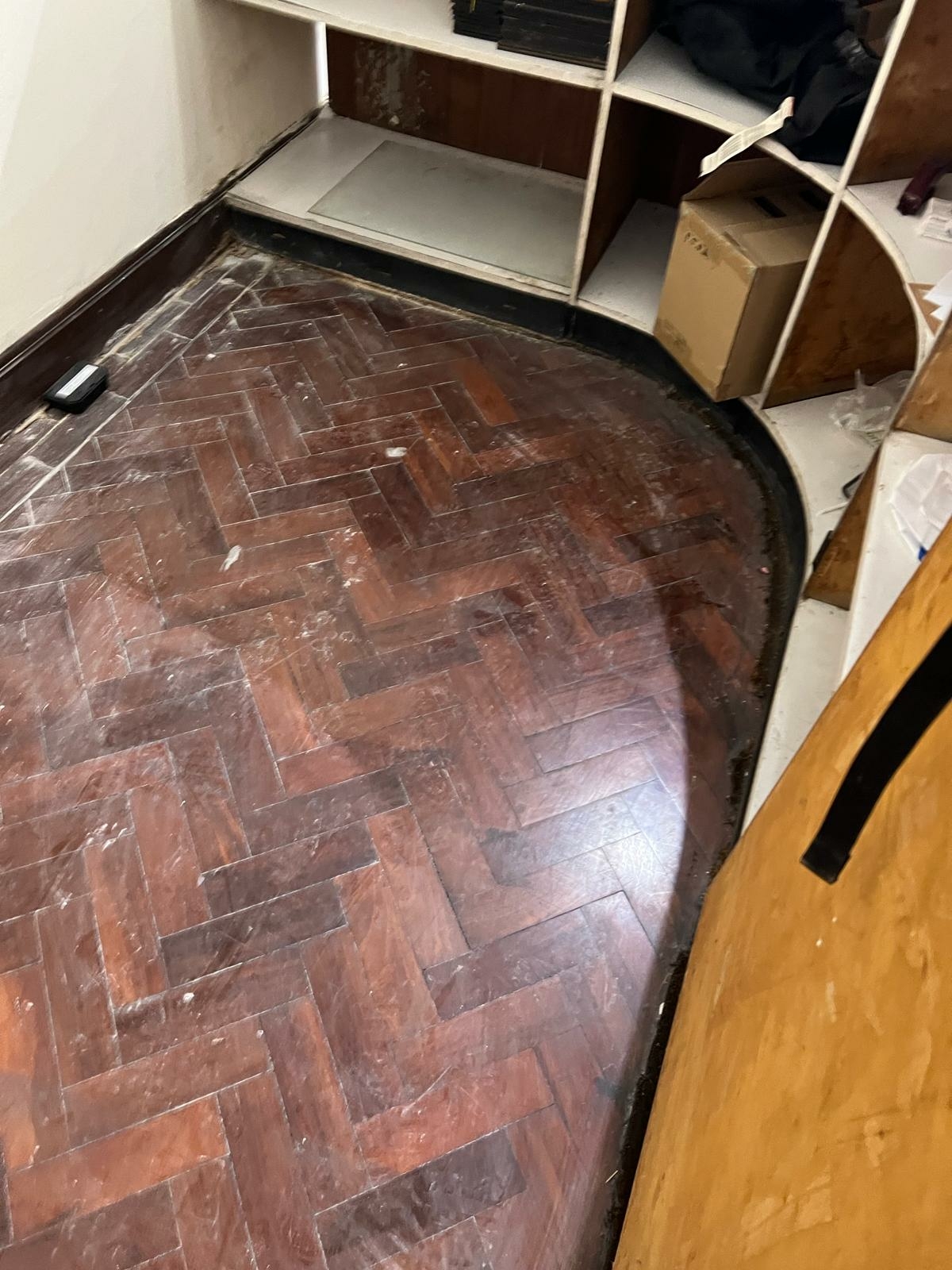 Period herringbone parquet on the ground floor of a conversion flat in WC2N. The floor was structurally sound but needed proper attention — loose blocks reglued, gaps filled, surface sanded and relacquered. The client had been putting it off for years. Once we got started it took one day to complete.
